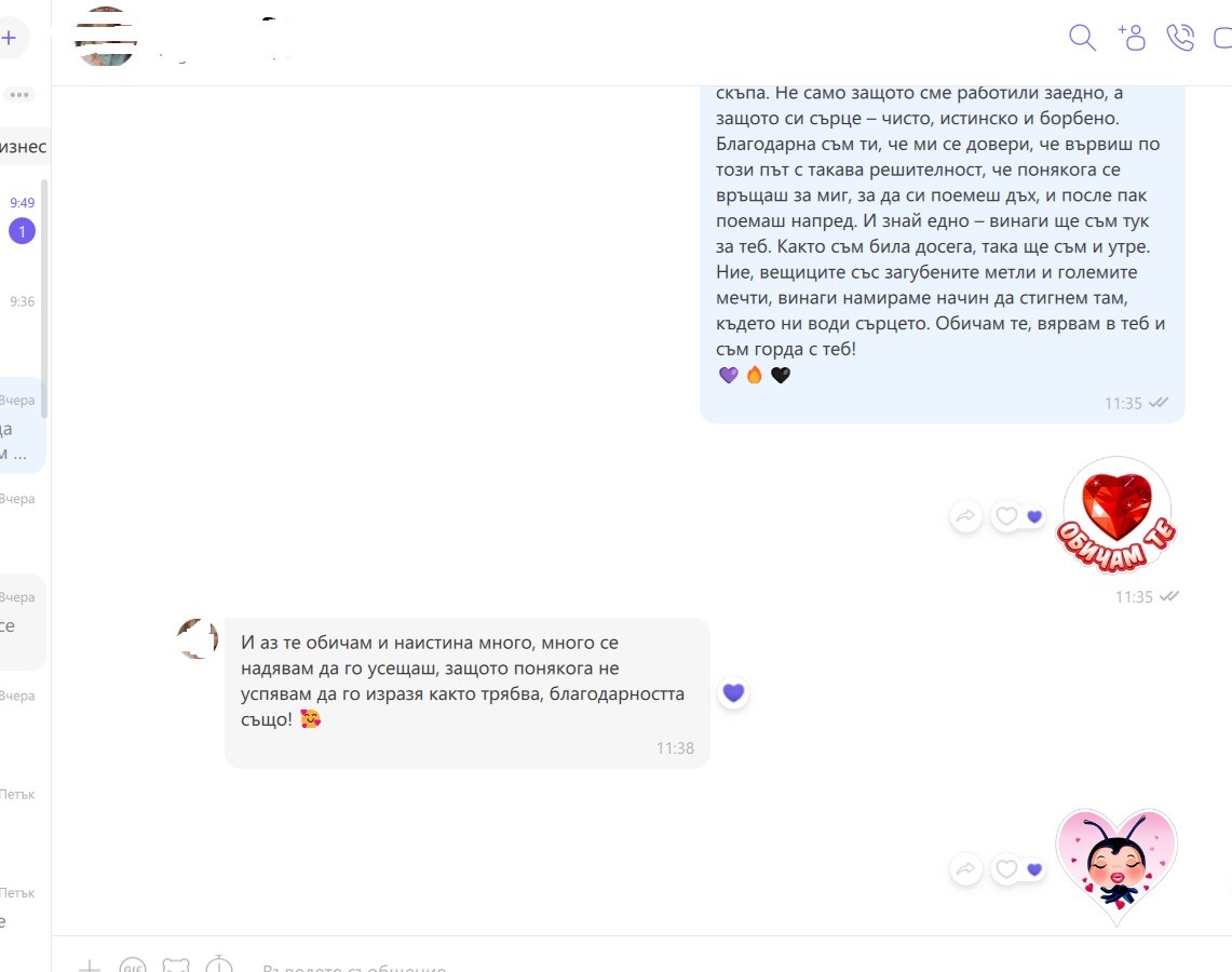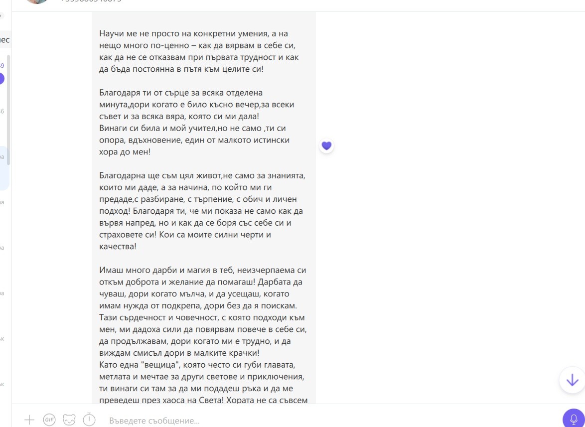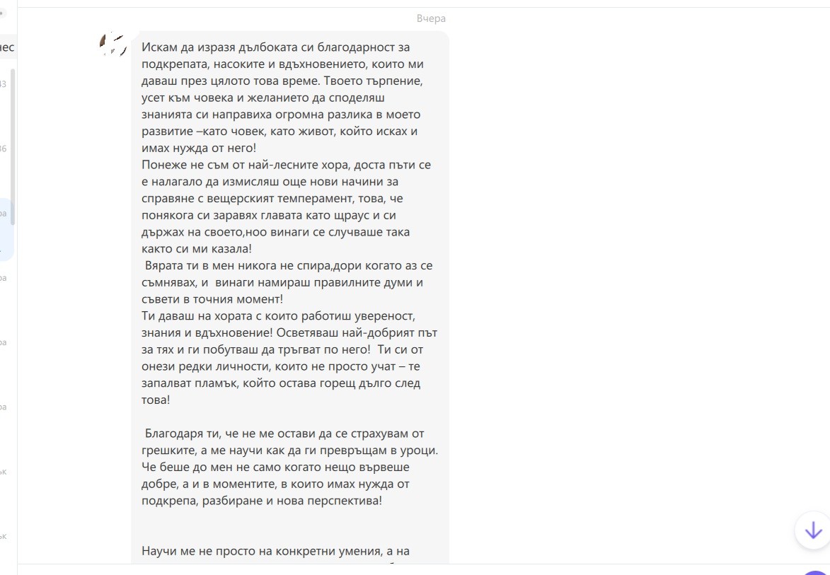 Има моменти, в които думите, които получавам от хората, с които работя, докосват сърцето ми толкова дълбоко, че ме оставят безмълвна. Всеки отзив е безценен за мен. Той е не просто признание за труда, знанието и отдадеността, които влагам, а истинска светлина по пътя ми. Светлина, която ми напомня защо съм избрала този път – да бъда до хората, да ги подкрепям, да им помагам да откриват вяра в себе си и смелост да следват мечтите си.