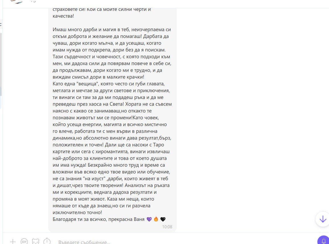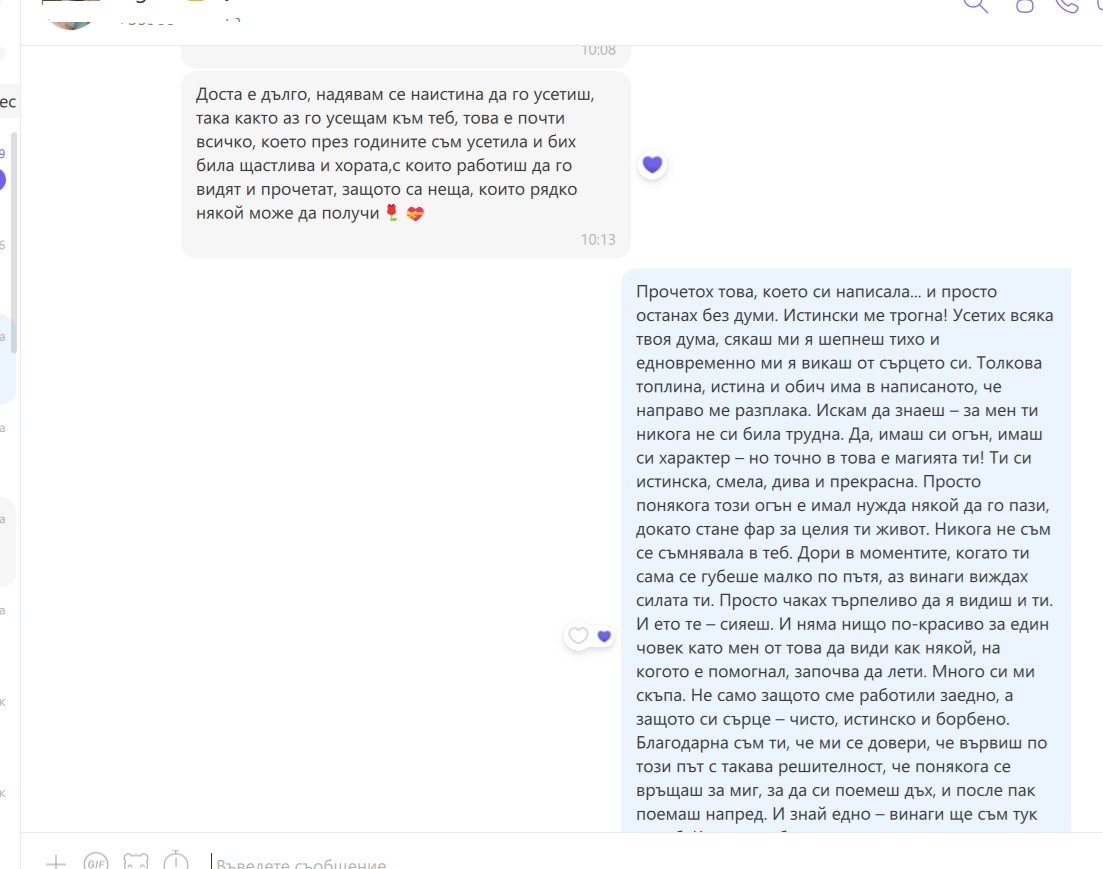 Благодаря за доверието, за искрените думи, за топлината и любовта, които усещам във всеки ред. Това е най-голямата награда и най-истинското потвърждение, че усилията ми имат смисъл. Ще продължавам да давам най-доброто от себе си – с душа, със сърце и с цялата си отдаденост.