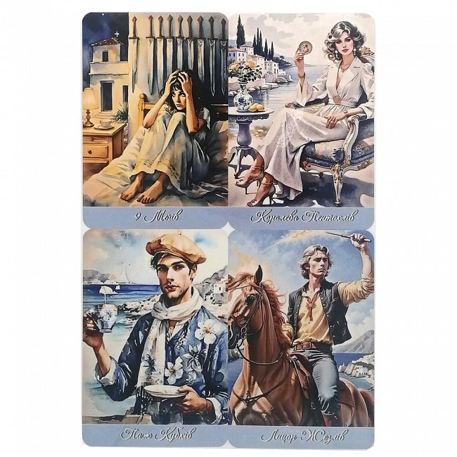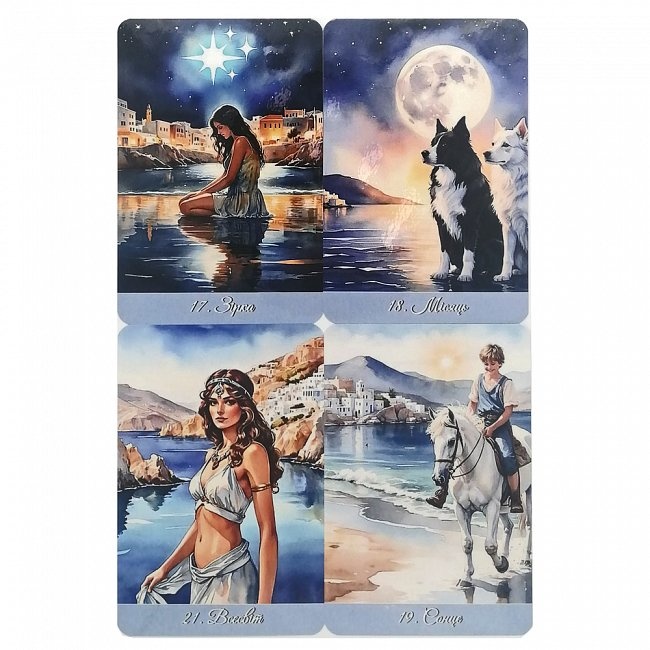 Потопи се в носталгията по гръцкото лято на 70-те години – епоха на безвремие, слънце и бохемна свобода. Колода, вдъхновена от класическата гръцка култура, митология и безвремието на Средиземноморието. Всяка карта е създадена с усещане за златен прах по кожата, морски бриз в косите и спомени от отминали животи, когато богове и хора са вървели рамо до рамо.