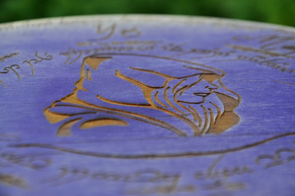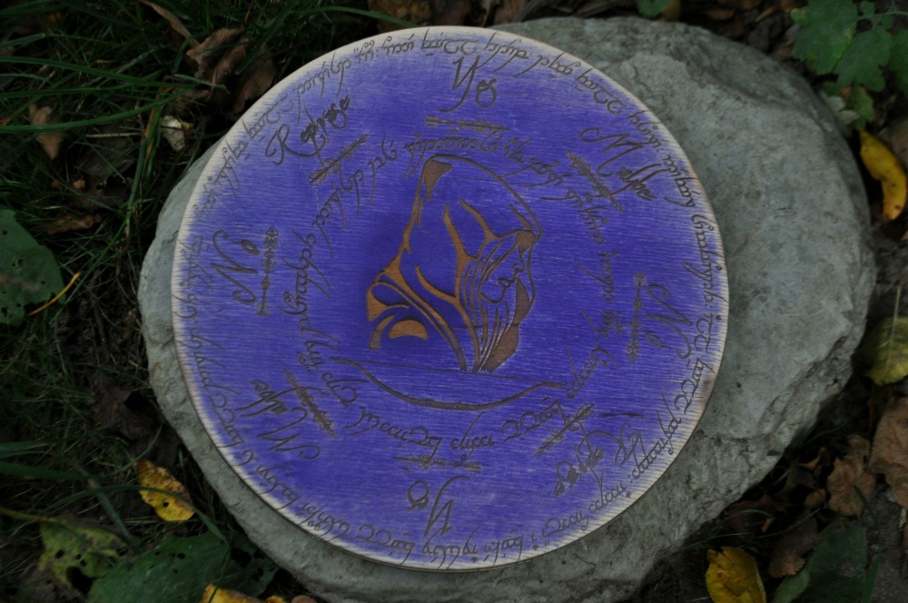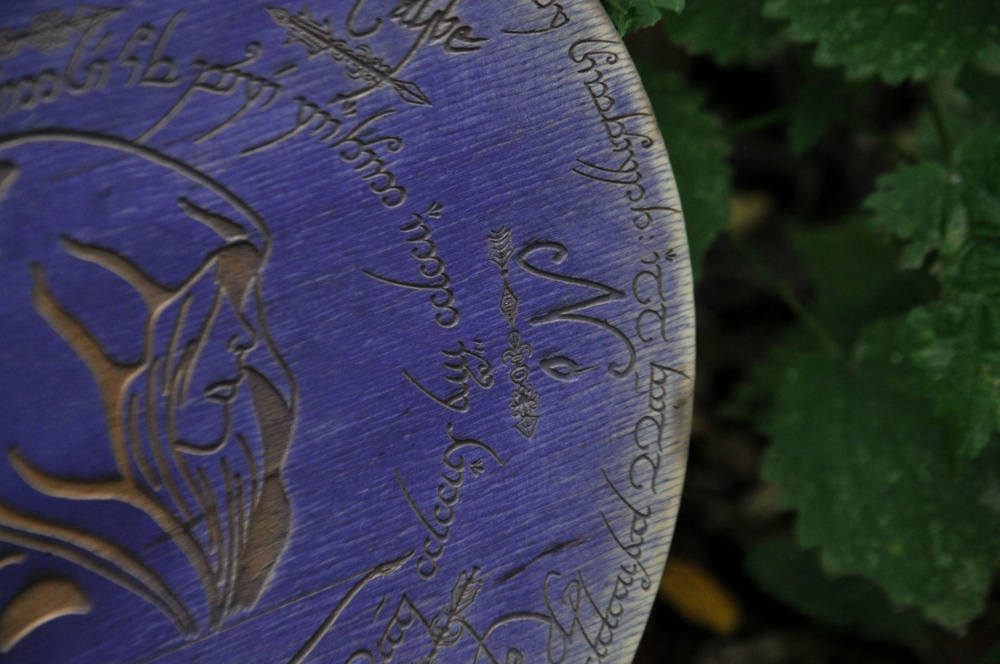 Дъска за гадаене с махало. Може да се използва и като декоративен елемент. Символите във вътрешния и външния кръг са истински елфийски думи (Една стрелка ще ви насочи. Една ще ви спре. Две ще ви изплашат. Никой няма да ви утеши. Всеки ще подкани. И само мъдър стрелец ще избере къде да насочи стрелата си . Нека мислите ви се ръководят от сиянието на чистия разум.)